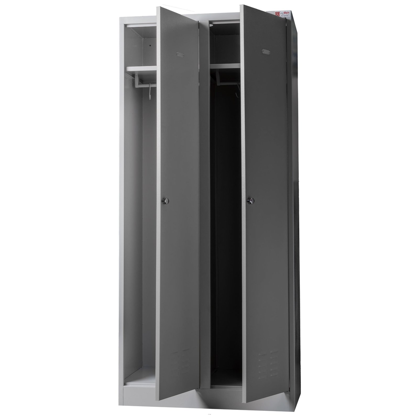 These wardrobe cabinets are made according to HACCP standards. They are hygienically adapted because the interior of the cabinets includes a vertical partition wall for storing civilian and work clothing separately.
